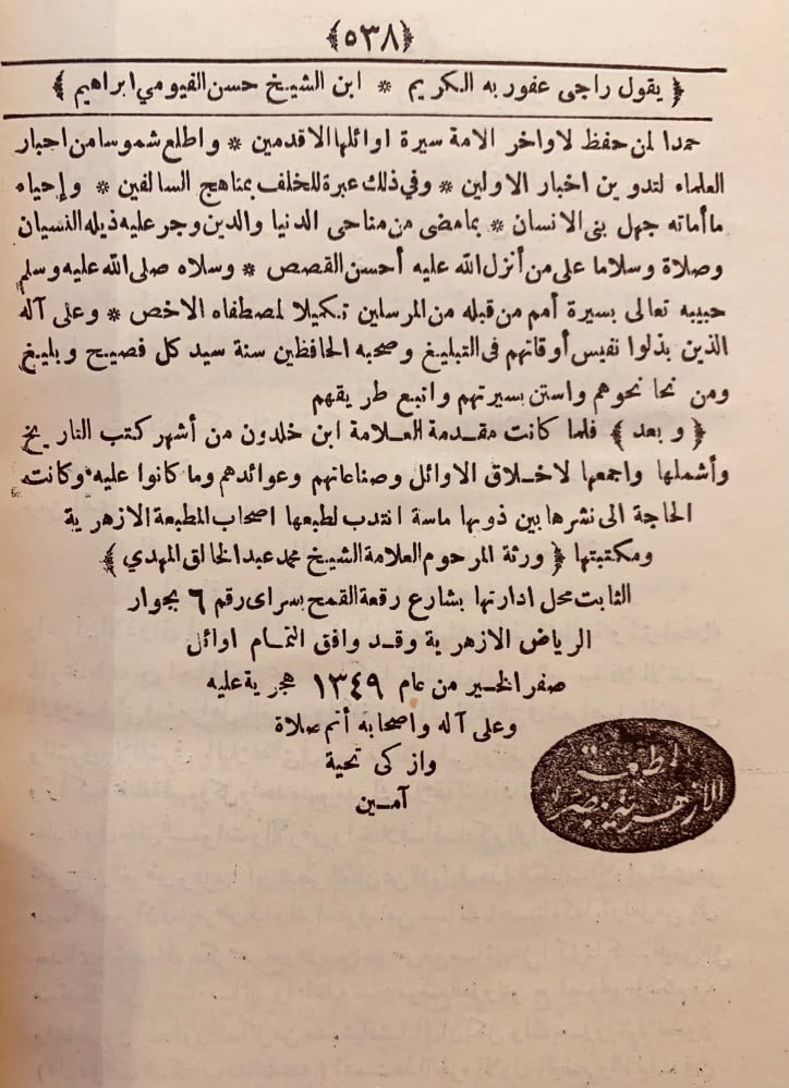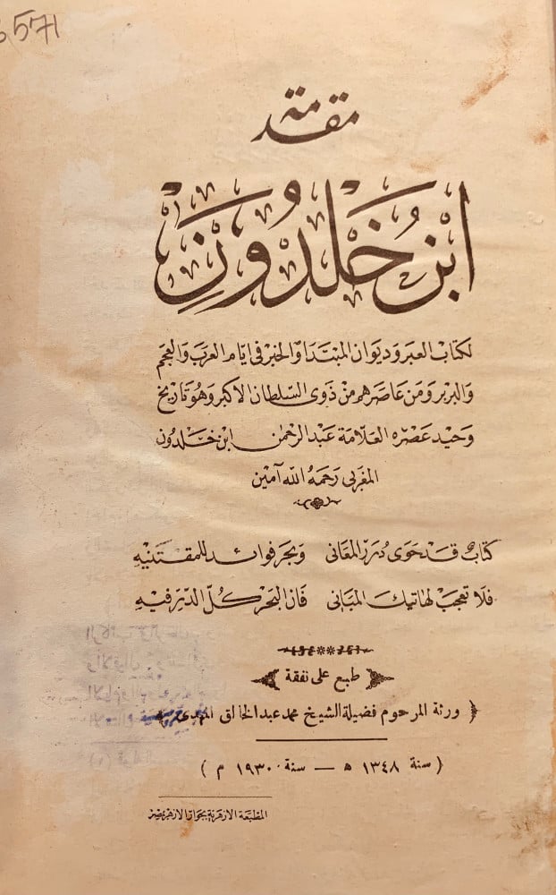 مقدمة ابن خلدون لكتاب العبر وديوان المبتدا والخبر في ايام العرب والعجم والبربر ومن عاصرهم من ذوي السلطان الاكبر وهو تاريخ وحيد عصره عبدالرحمن ابن خلدون