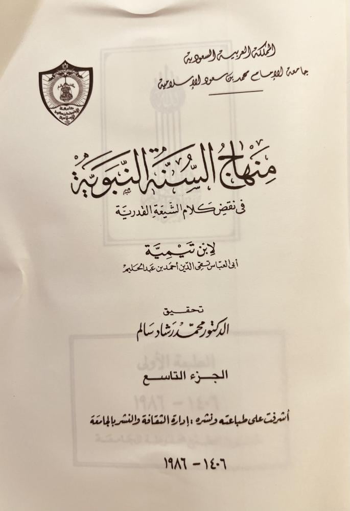منهاج السنة النبوية في نقض كلام الشيعة القدرية 9/1